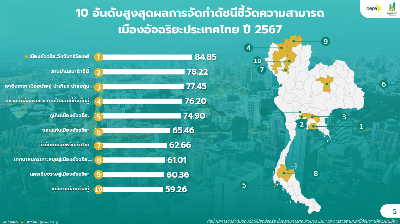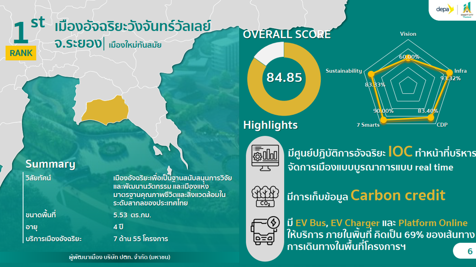 สำนักงานส่งเสริมเศรษฐกิจดิจิทัล หรือ depa ได้แถลงรายงานดัชนีชี้วัดความสามารถในการแข่งขันเมืองอัจฉริยะประเทศไทย ประจำปี 2567 (Thailand Smart City Competitiveness Index; TSCCI 2024) จาก 36 เมืองอัจฉริยะ ใน 25 จังหวัด โดยผ่านการพิจารณาจาก 5 องค์ประกอบของแผนพัฒนาเมืองอัจฉริยะ ได้แก่ การกำหนดวิสัยทัศน์ การพัฒนาโครงสร้างพื้นฐานทั้งทางกายภาพและดิจิทัล การพัฒนาระบบข้อมูลเมือง การบริการระบบเมืองอัจฉริยะ 7 ด้าน และการบริหารจัดการอย่างยั่งยืน ซึ่ง เมืองอัจฉริยะวังจันทร์วัลเลย์ ได้รับคะแนนชี้วัดความสามารถในการแข่งขันสูงที่สุดในการจัดอันดับเมืองอัจฉริยะ ปี 2567